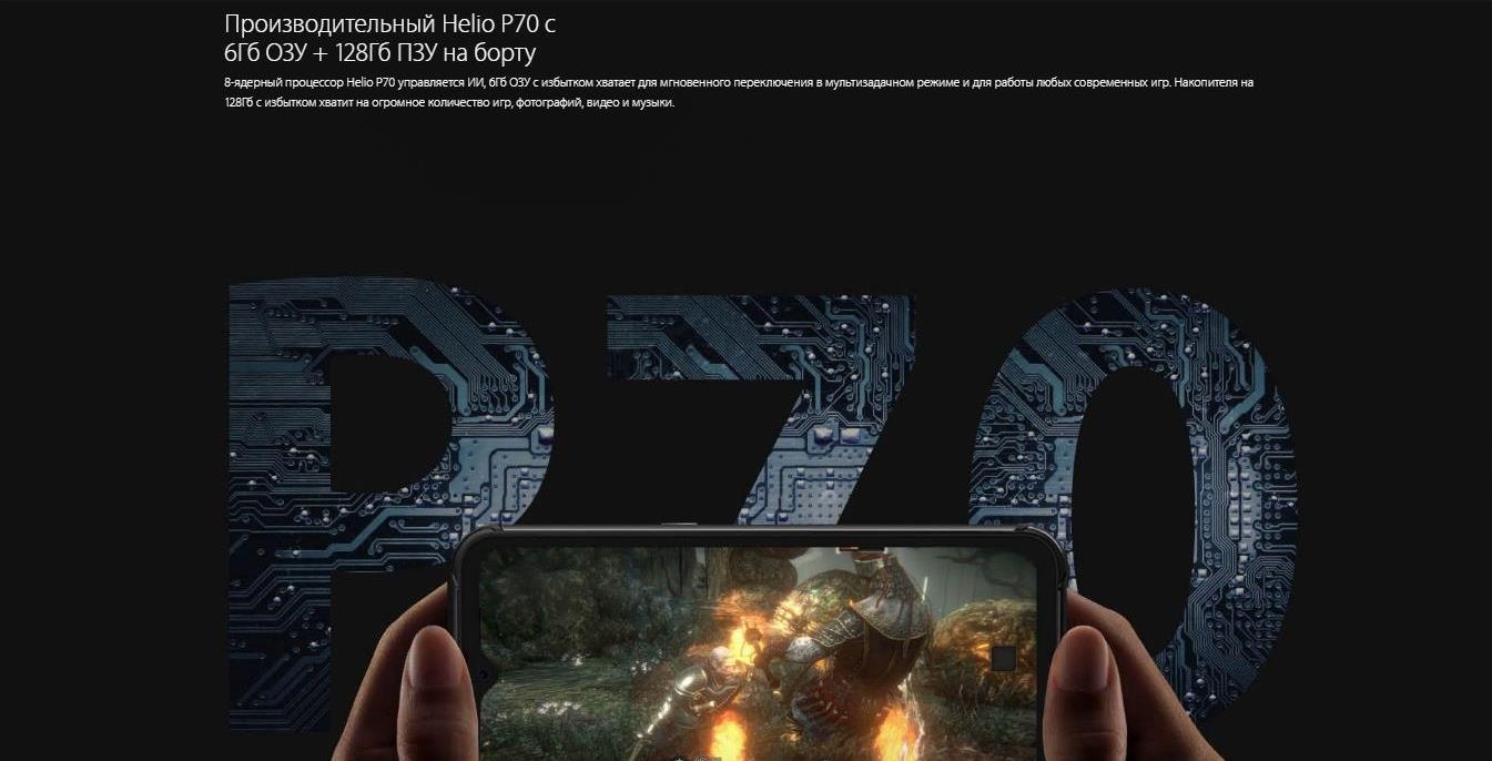 - 8-ядерный процессор Mediatek HELIO P70, оперативная память 6GB, встроенная 128GB, поддержка карт памяти microSD до 256GB;