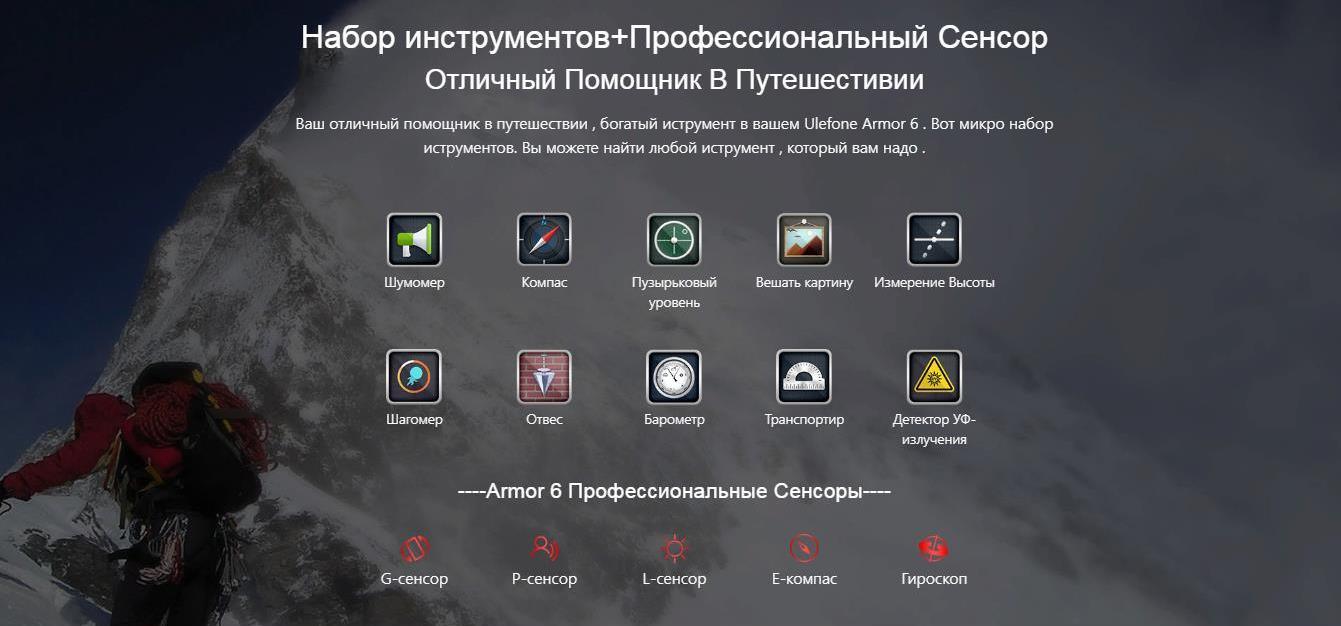 - Набор специальных программ: детектор УФ-излучения, измеритель шума, компас, нивелир, отвес, настенный уровень, дальномер, увеличительное стекло, шагомер, барометр, угломер, переводчик.